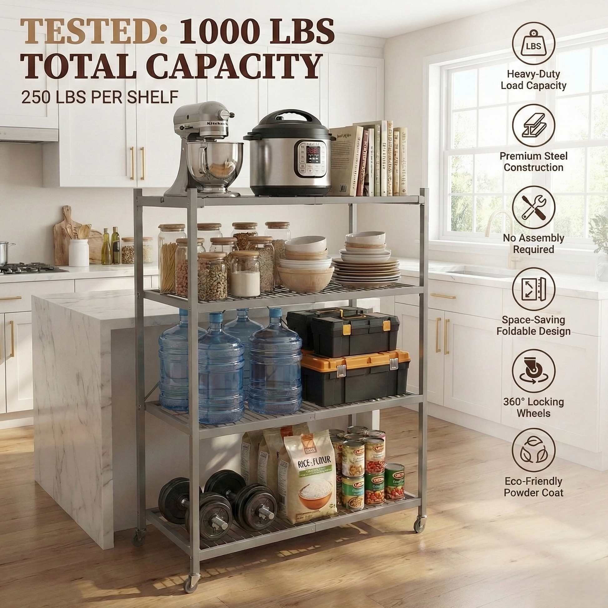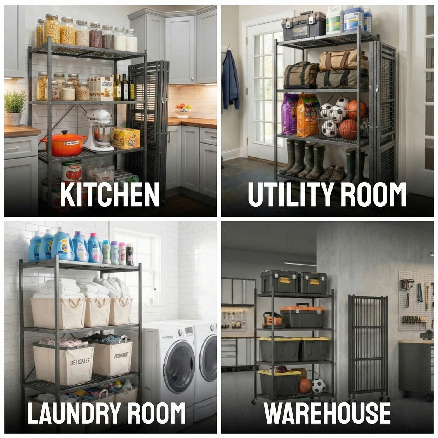 100% pre-assembled design-just unfold in seconds. Supports 250 lbs per shelf, making it the fastest way to organize yourgarage or pantry.