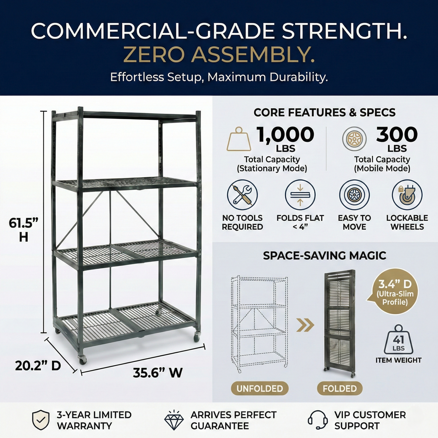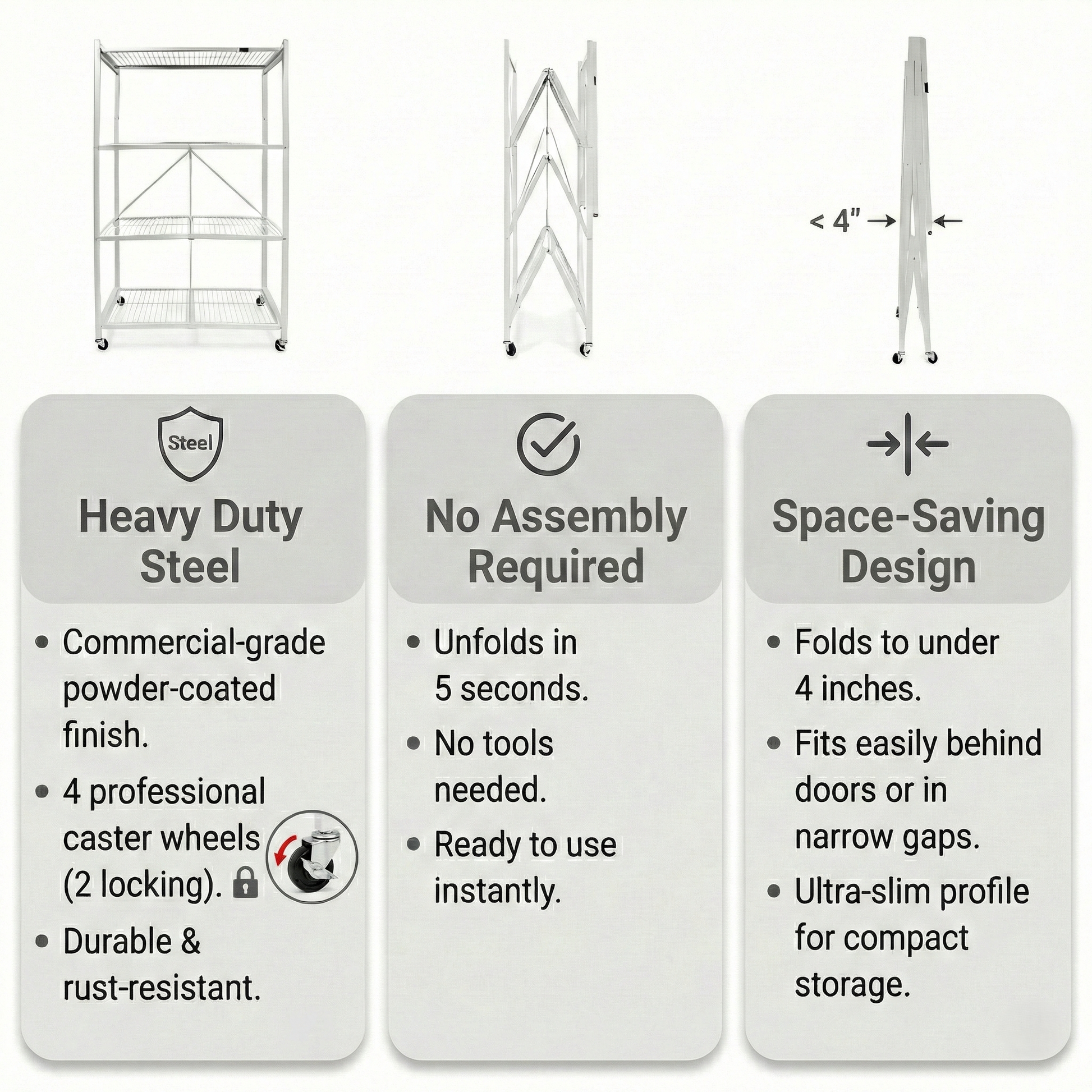 360° mobility meets industrial strength. Collapses to just 3 inches wide for easy storage behind doors or in closets.